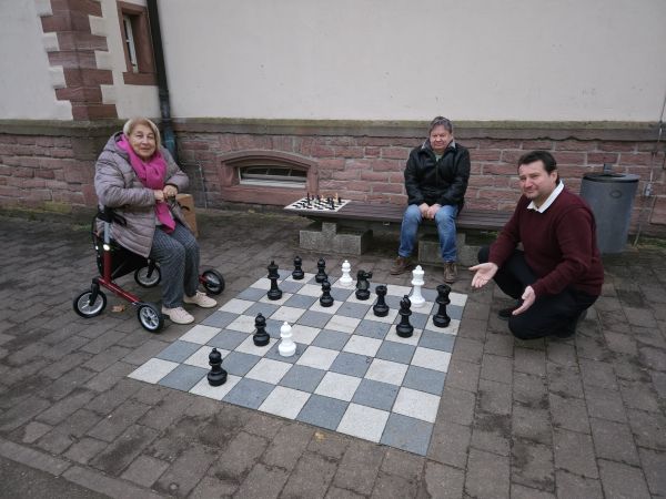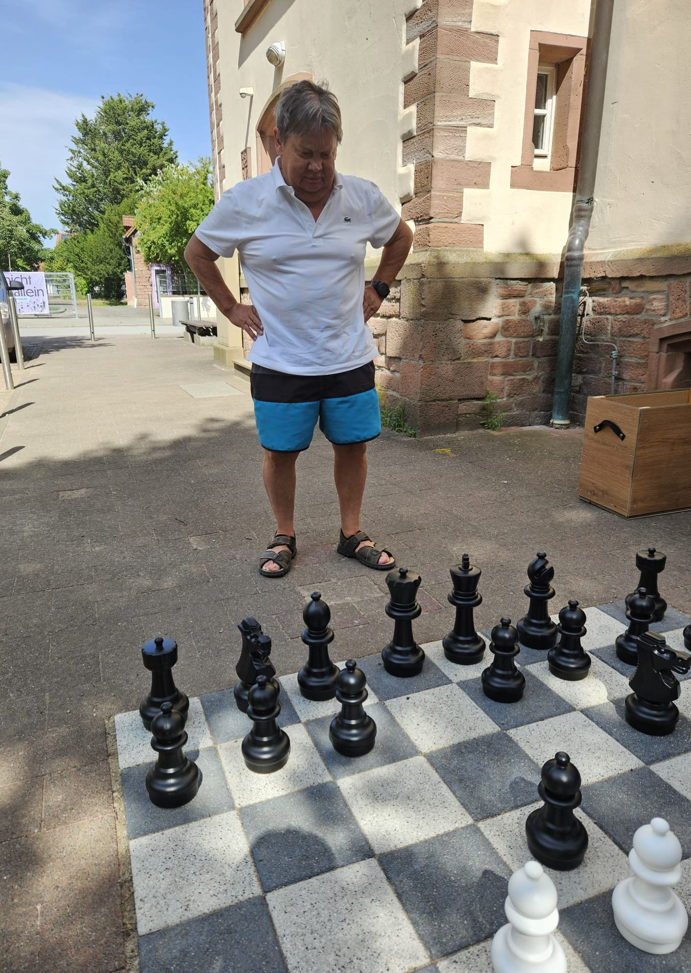 | Bernd Hülder, alter und neuer Vorsitzender des SV Biblis, beim Schachspielen auf dem Großfeld am Nordheimer Rathaus |